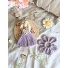 Něžná macrame andělka na větší dřevěné destičce ( průměr 13cm) symbolizující ochranu a klid, doplněná o macrame kytičku. Perfektní jako dárek pro každou maminku.