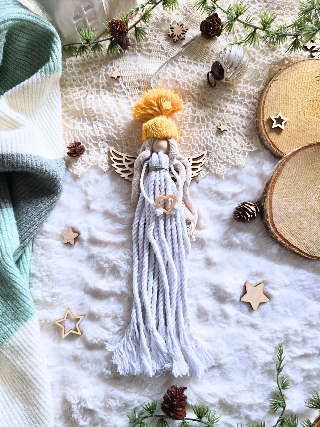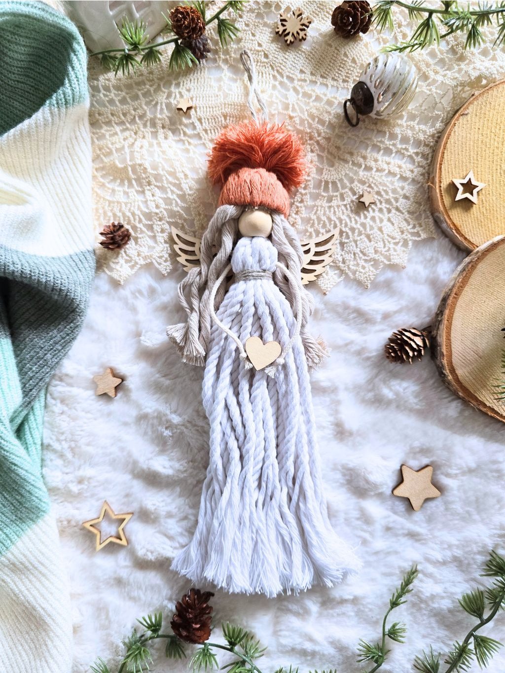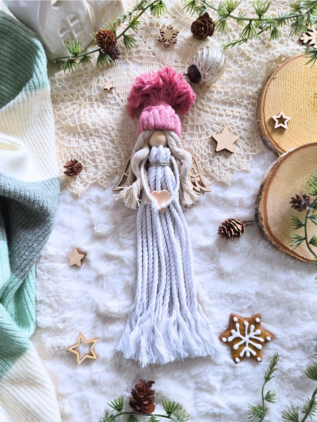 Bytůstka s křídly a čepicí je téměř pohádková ozdoba. Tato jedinečná macramé bytůstka je dokonalým vánočním prvkem vašeho domova nebo originálním dárkem pro ty, které chcete potěšit.