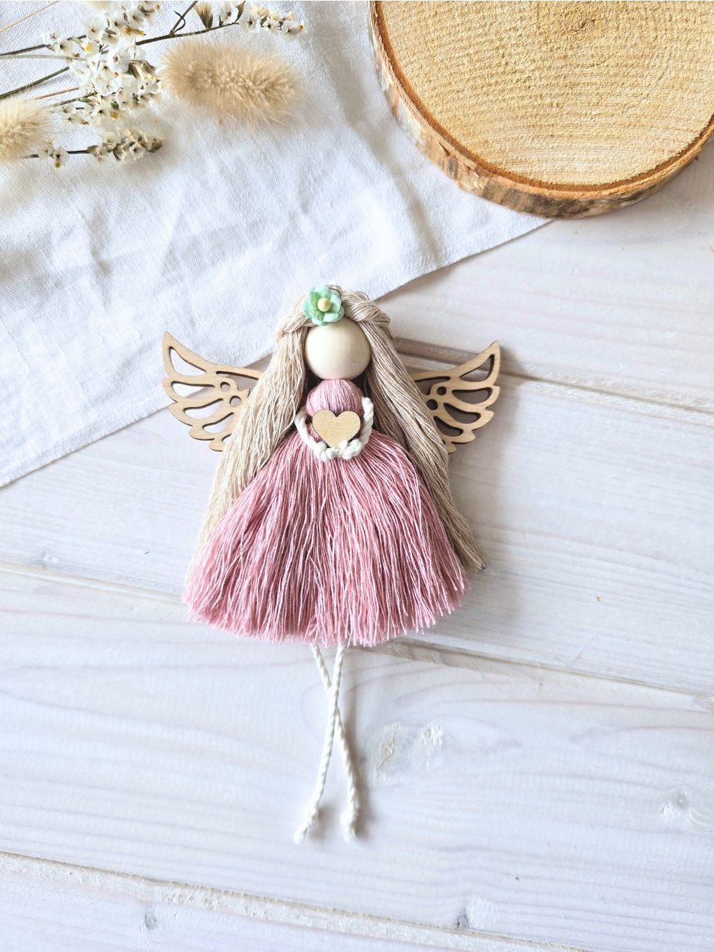 Celková délka Macrame Andělky je cca 18 cm bez závěsu.Složení: recyklovaná bavlna, zlatá příze, dřevěný korálek, dřevěné srdíčko, dřevěná křídla, papírová kytičkaMacrame Andělka je určena pouze k dekorativním účelům, není to hračka!