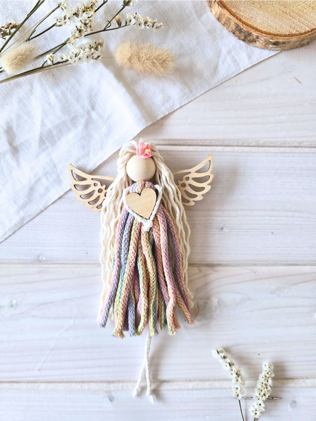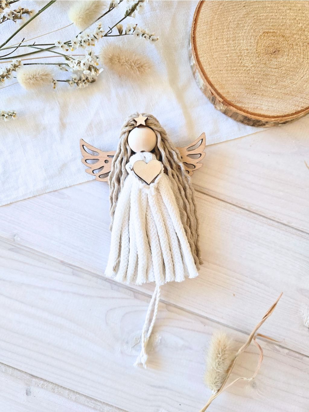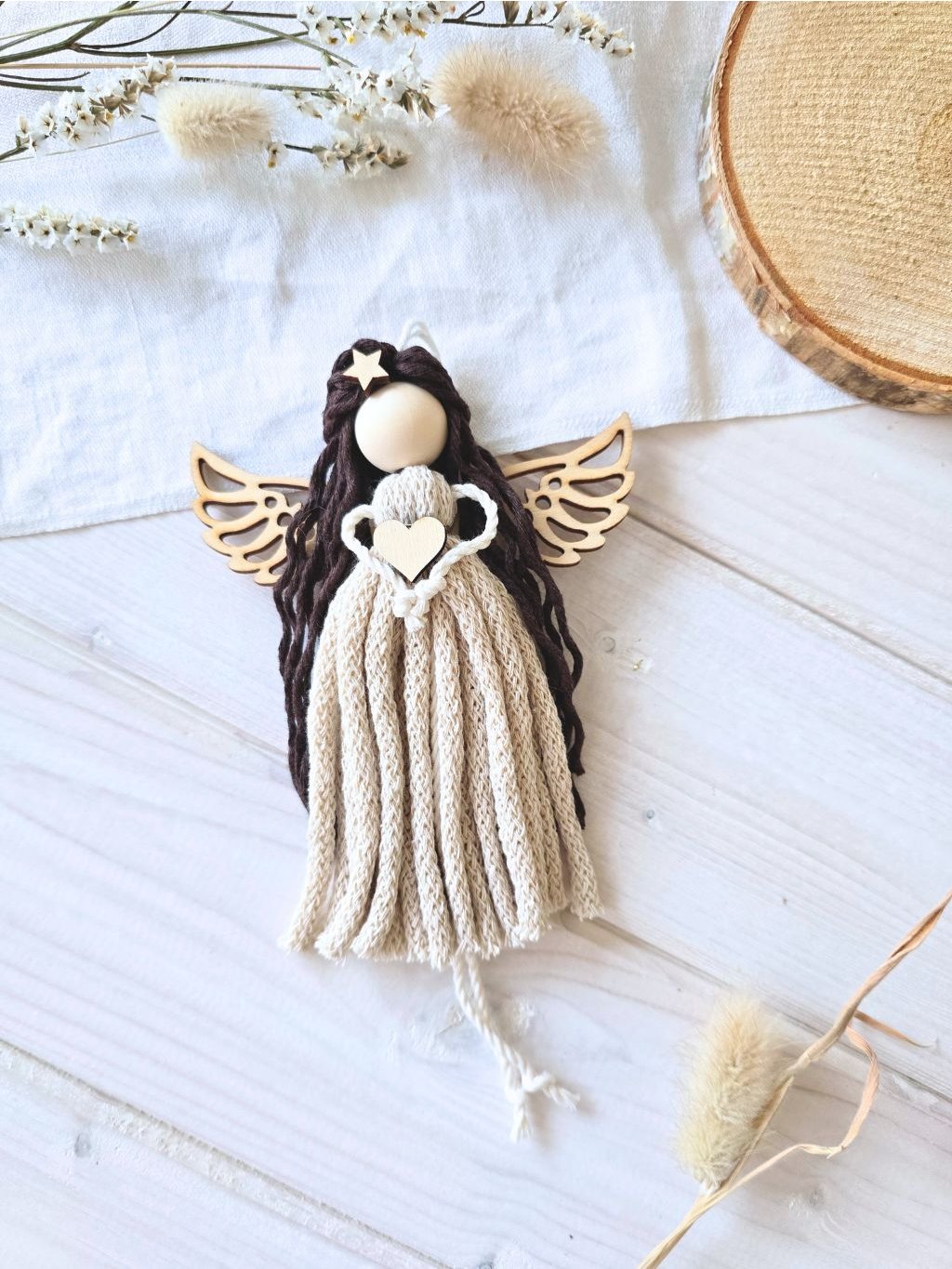Celková délka Macrame Andělky je cca 15 cm bez závěsu.Složení: 100% bavlněná příze, zlatá příze, dřevěný korálek, dřevěné výřezy, dřevěná křídlaMacrame Andělka je určena pouze k dekorativním účelům, není to hračka!