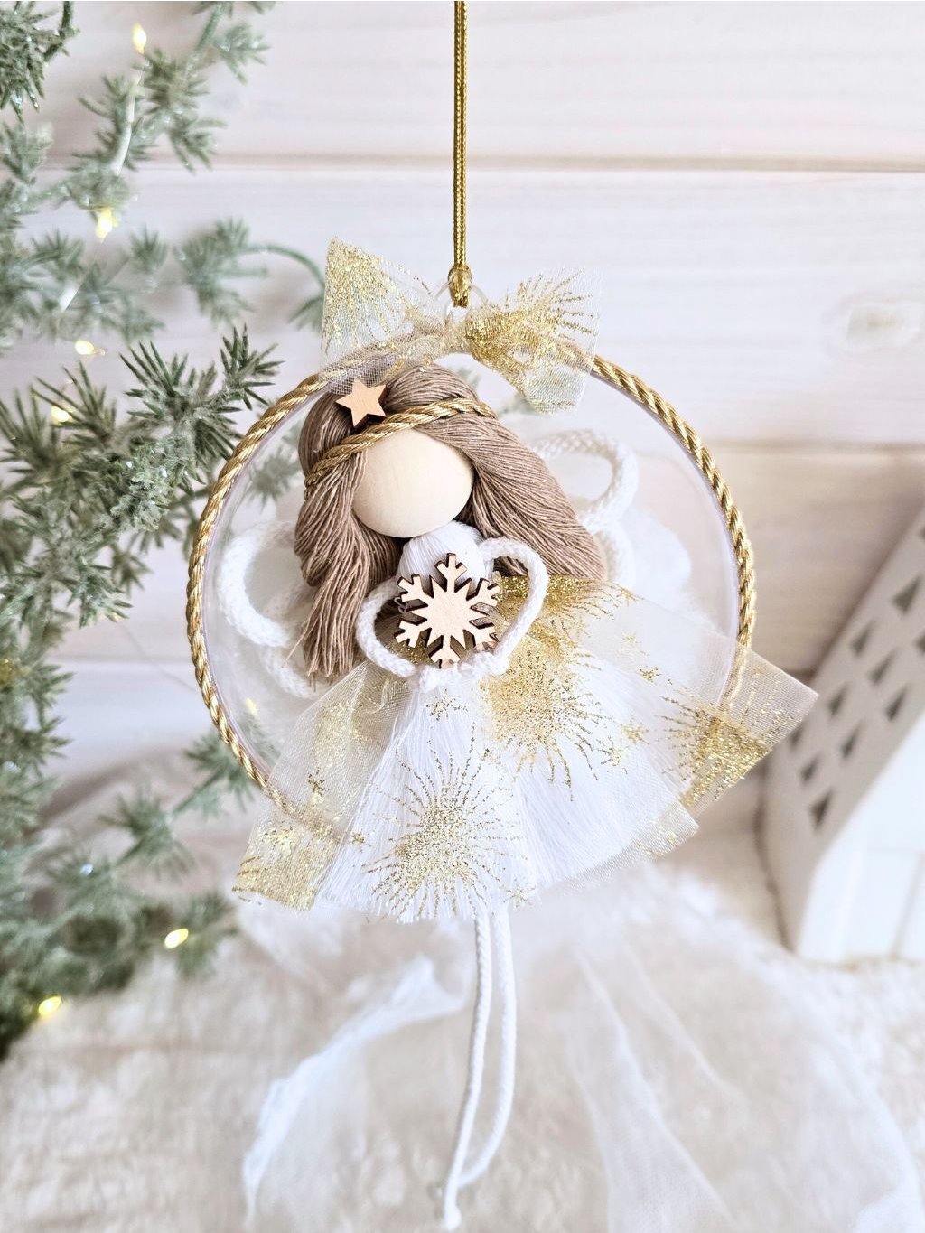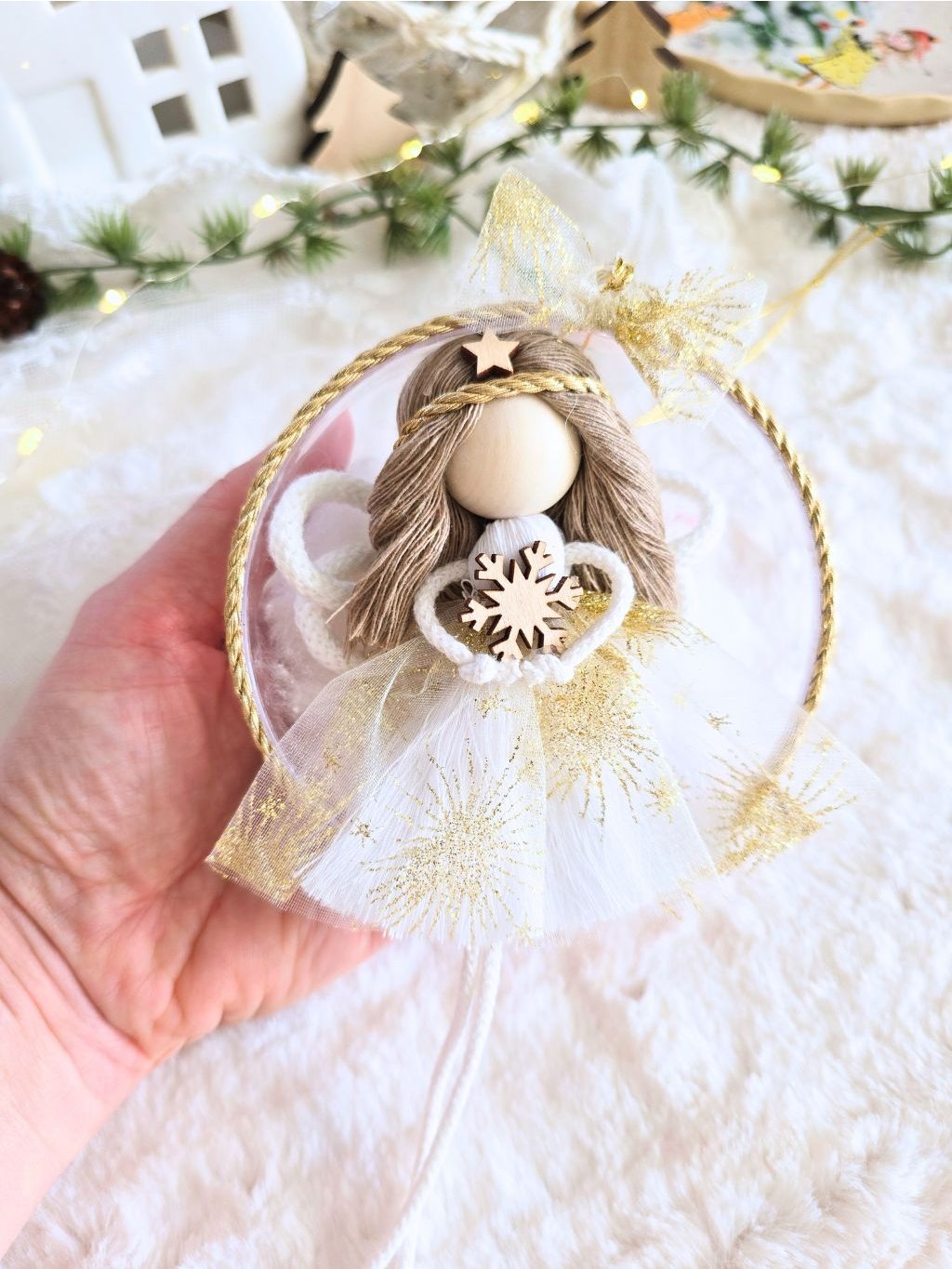 Sedí v průhledné baňce (kouli), která jí dodává lehkost a krásně se hodí na větší stromeček, zavěšená v prostoru, u okna nebo jako originální vánoční dárek pro někoho, koho chcete potěšit.Macrame andělka má tylovou sukýnku se zlatými detaily, hvězdu ve vlasech a drží dřevěnou vločku - dohromady tak vytváří klidnou, něžnou atmosféru, která k Vánocům prostě patří.