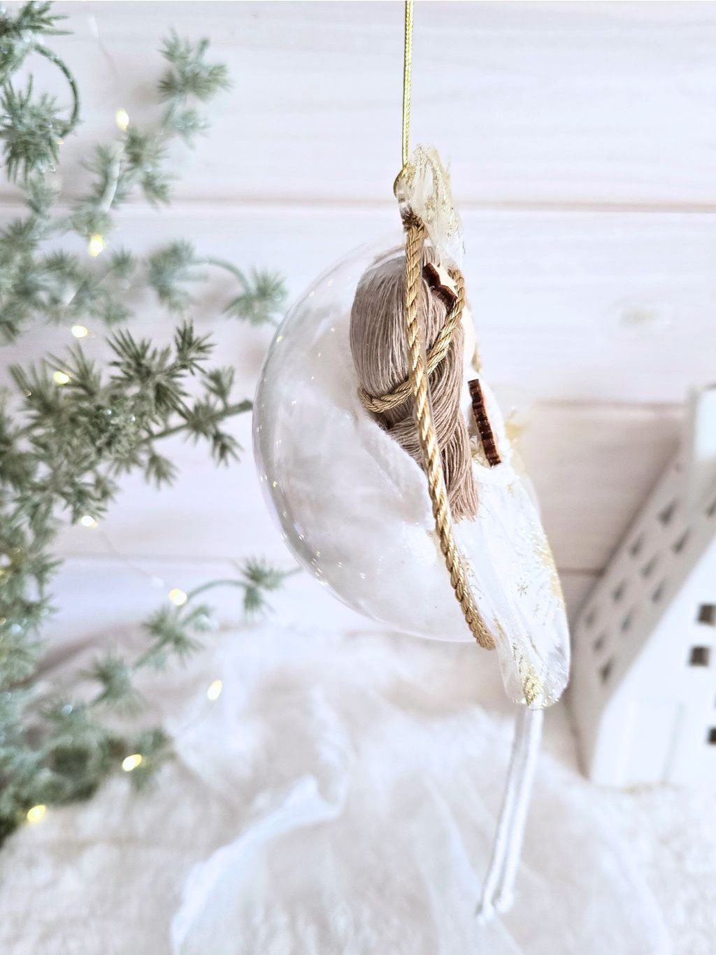 Jemná macrame andělka v průhledné baňce, s tylovou sukýnkou, působí lehce a krásně doplní vánoční výzdobu.