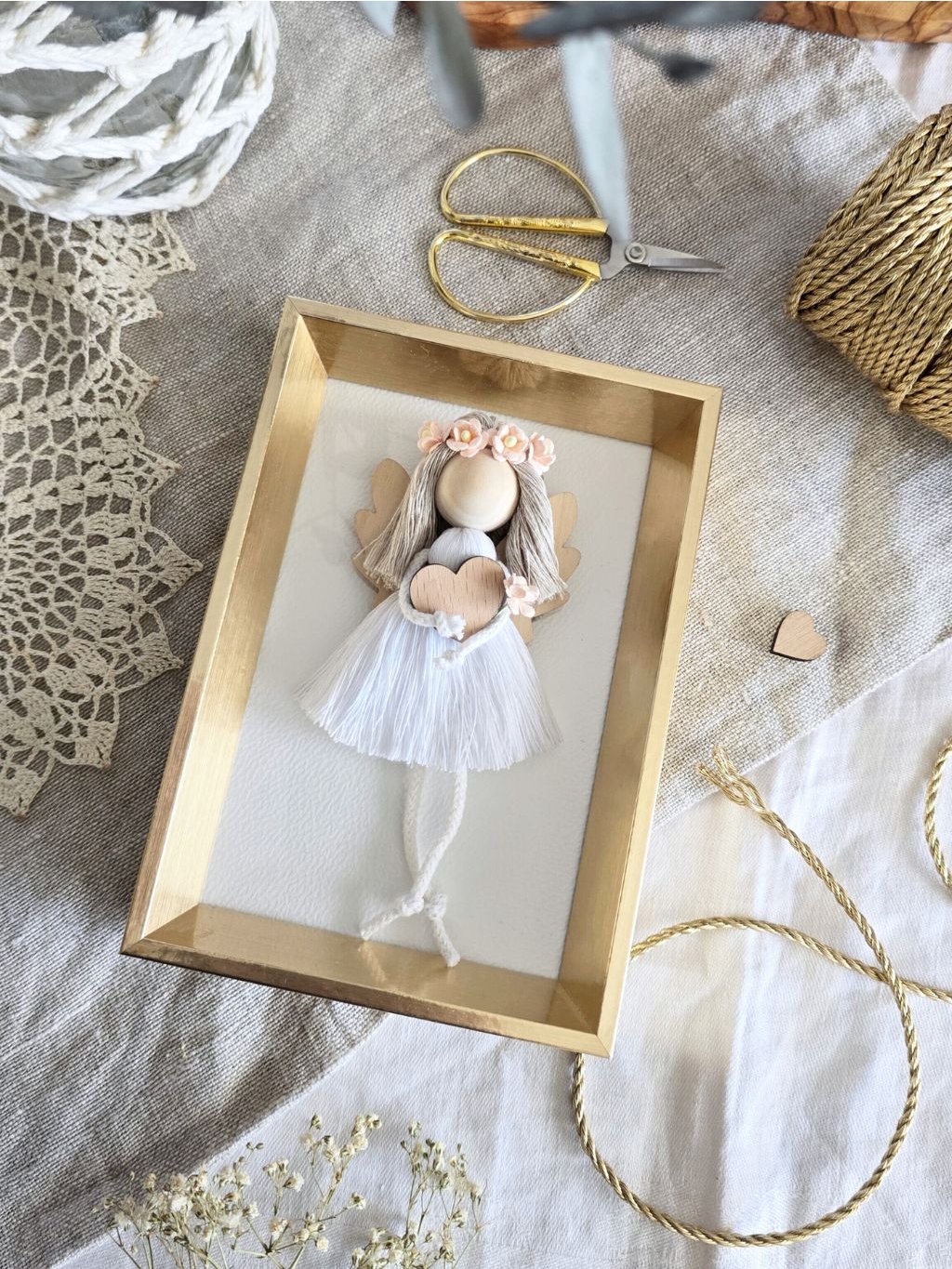 Složení: 100% bavlna, dřevěný korálek, dřevěné srdíčko, dřevěná křídla, dřevěná hvězdička, lurexový provázek, organza, rám